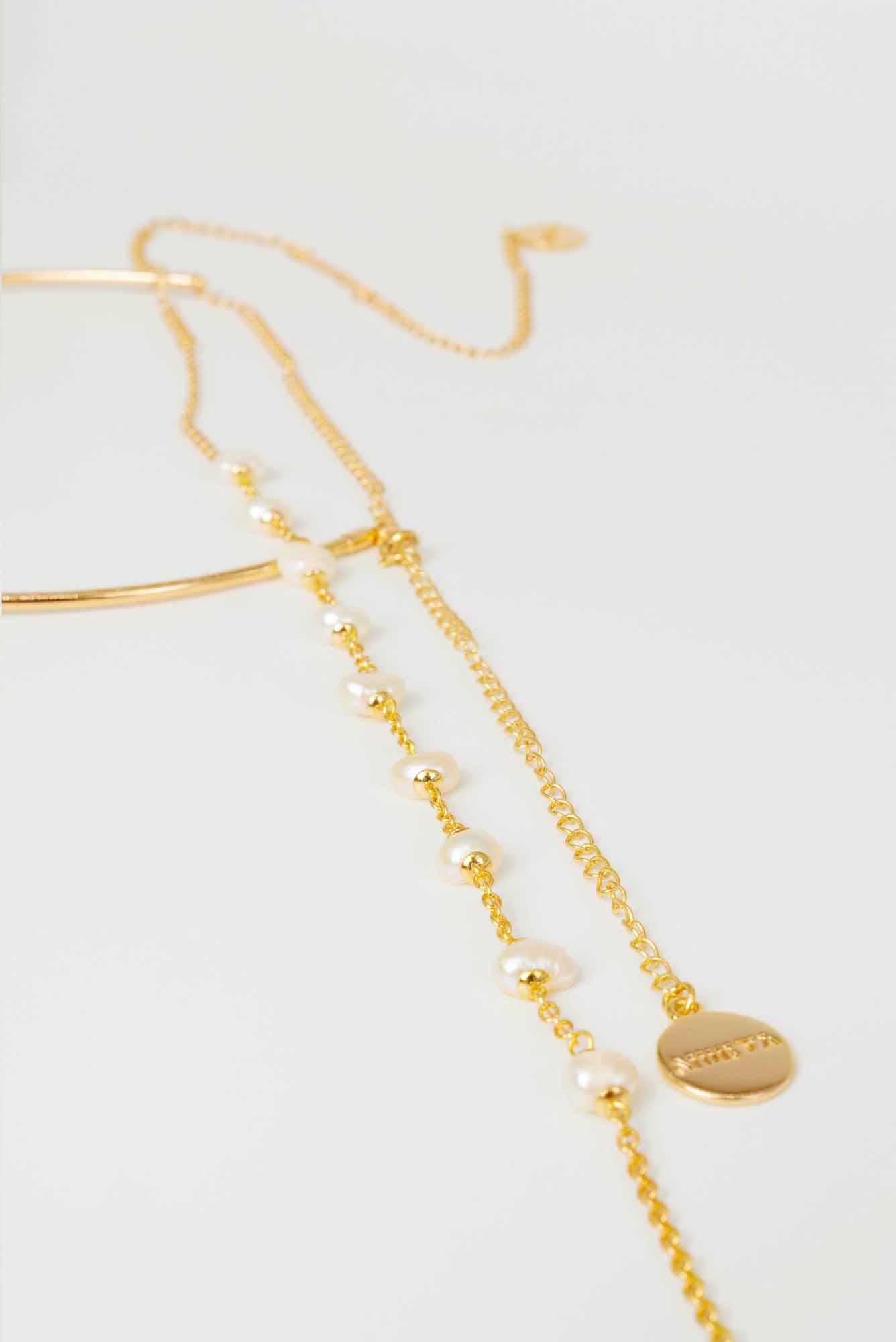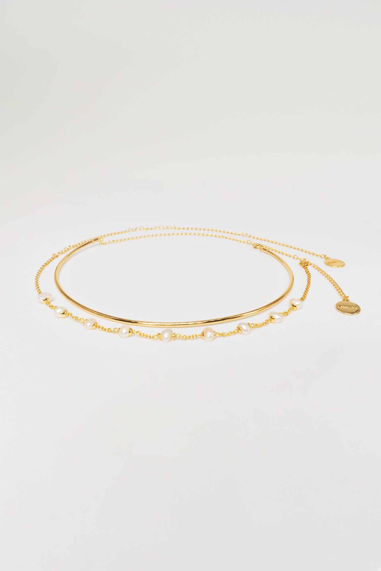 The necklace was inspired by the pearl devotee – Grace Kelly. It comes as a set to create an elegant contrast, with one part made of a dainty chain adorned with pearls and the other a solid gold-plated metal choker. Creating a style that is “Feminine, with a bit of edge”.