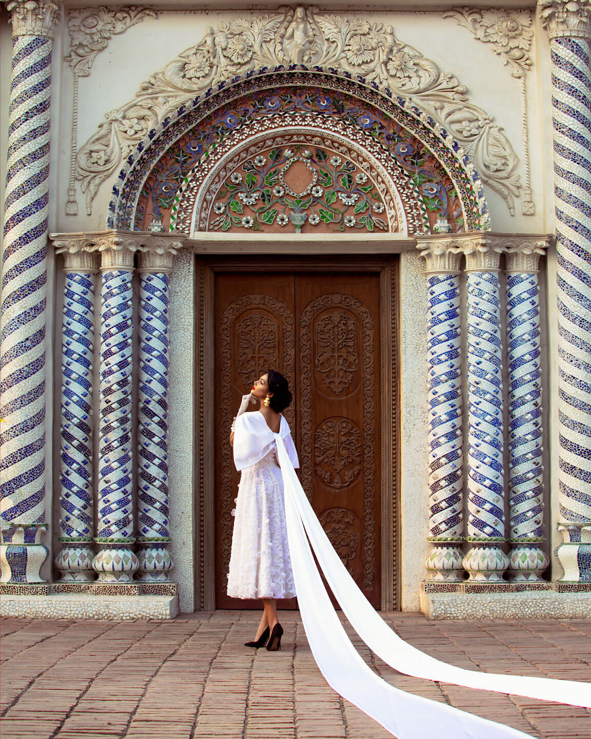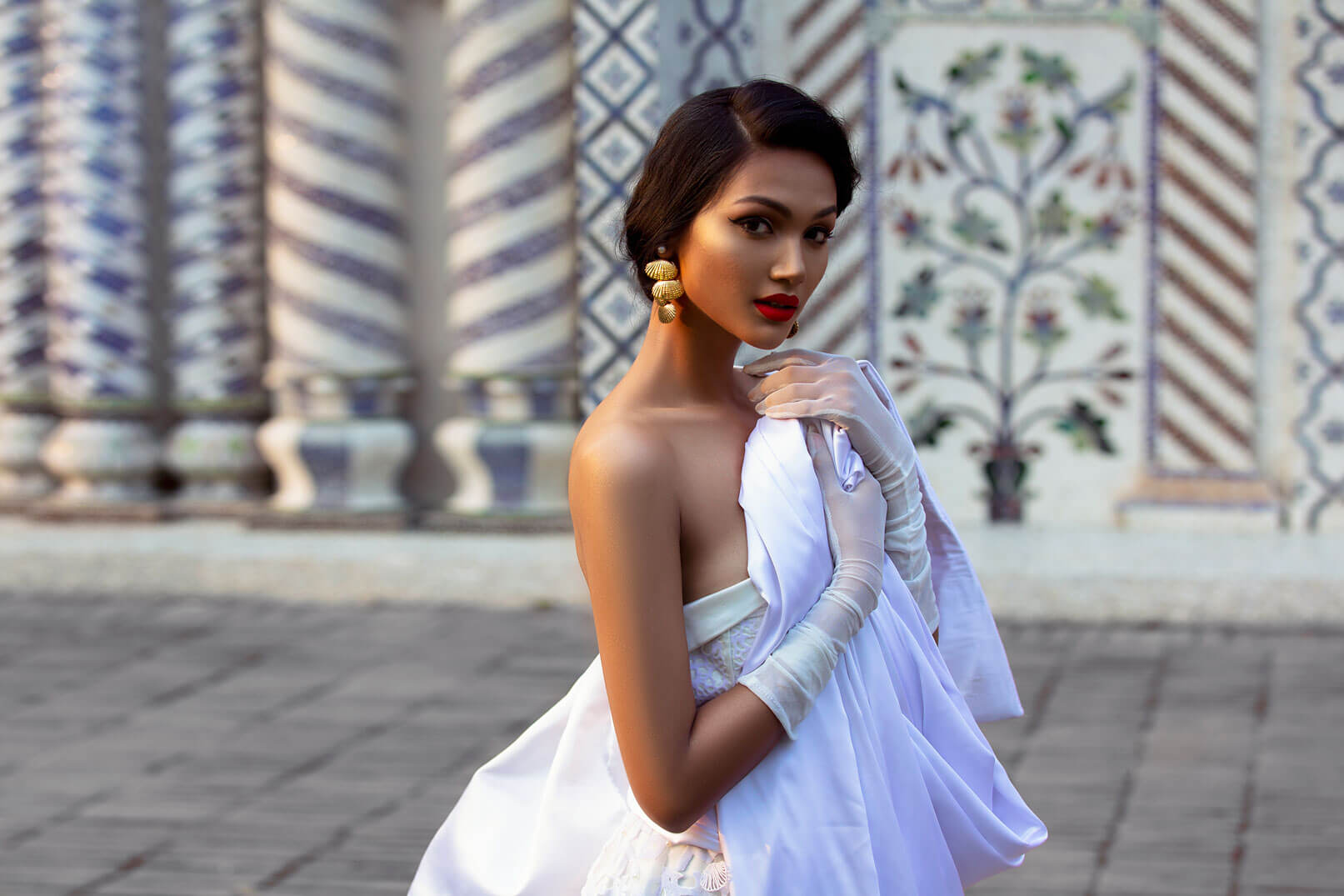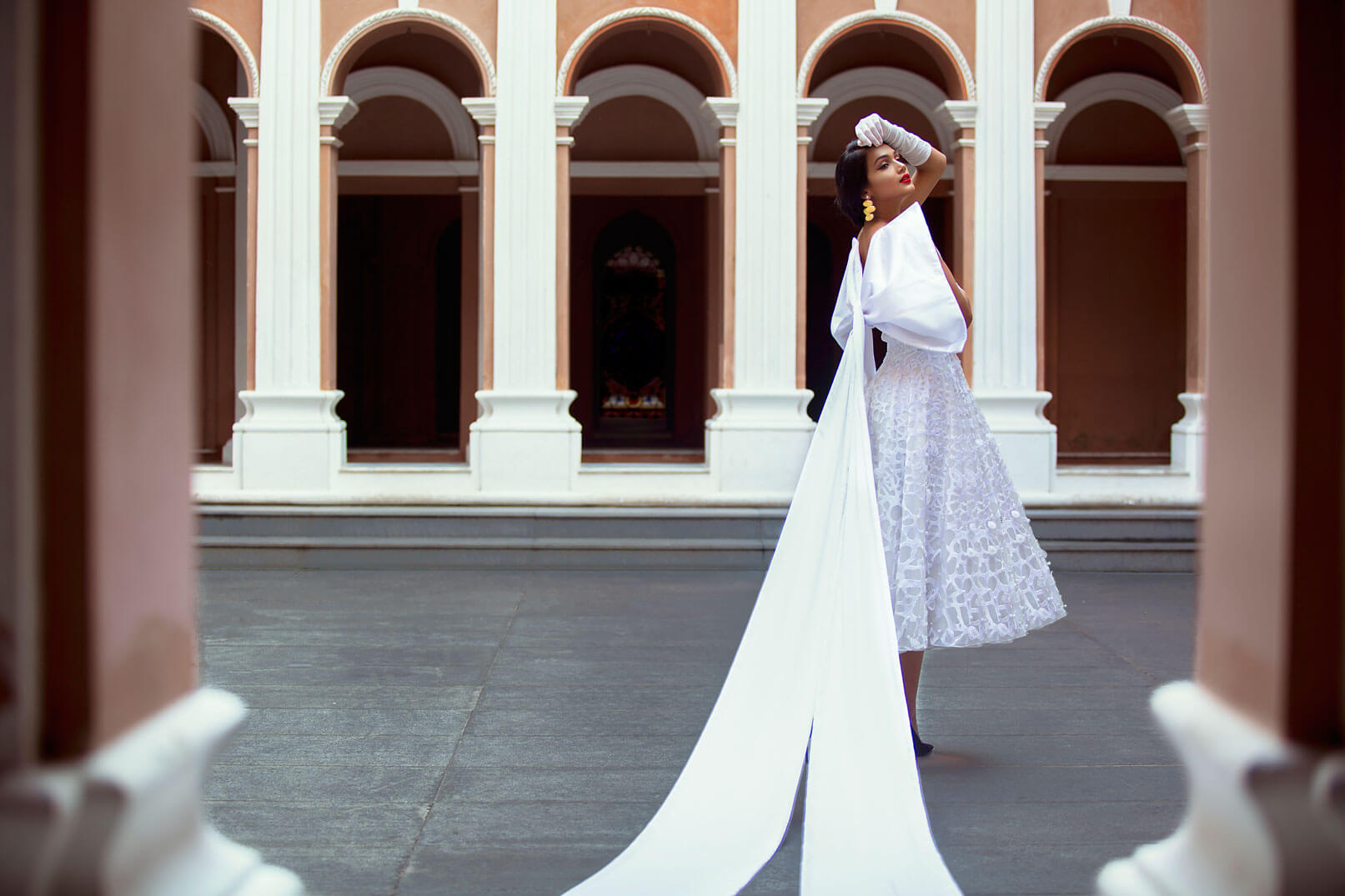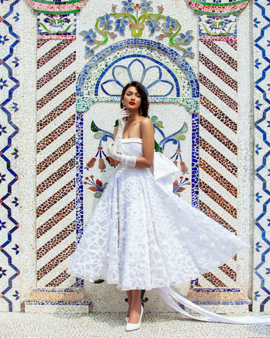 This ethereal pearl white midi-length gown is a true homage to the era of elegance – the 50s.