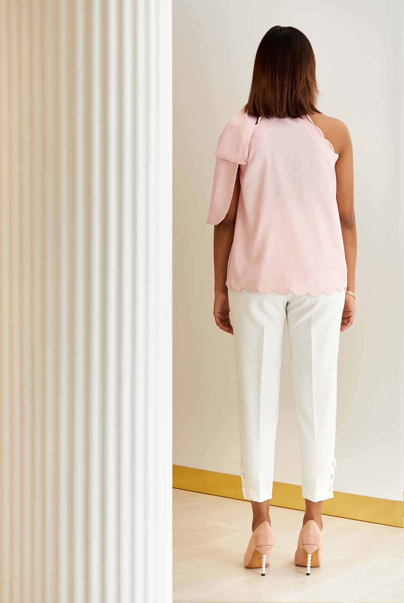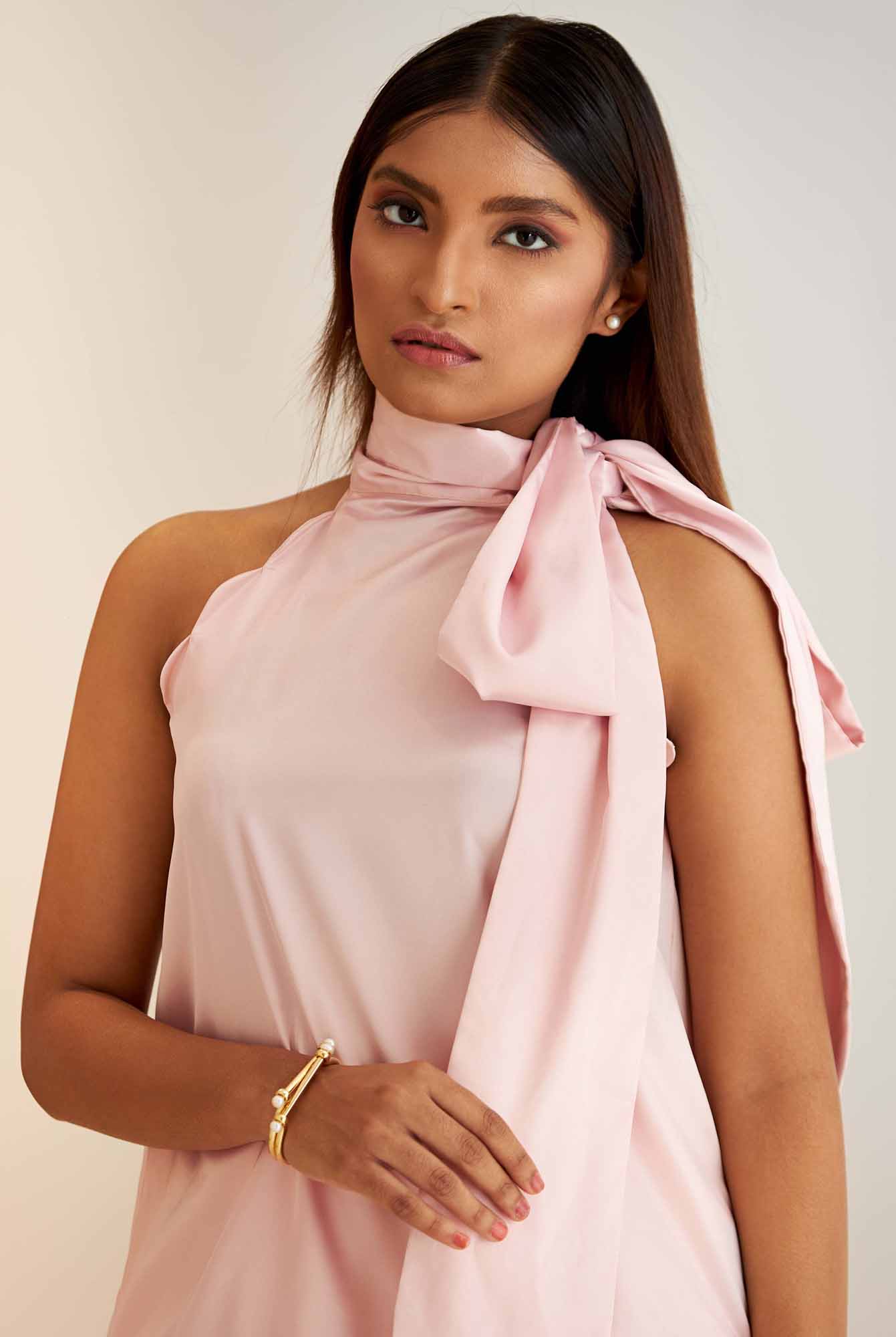 The A line silhouette, made famous by Jackie Kennedy, is crafted from smooth satin with a sleeveless halter neck is elevated by scalloped hem mimicking the curve in edges of a shell, and has a silky neck tie, resulting in an enduring femininity.