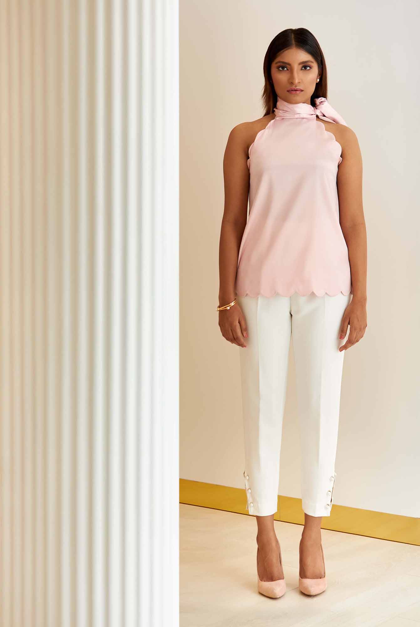 • Halter neckline with scalloped edge