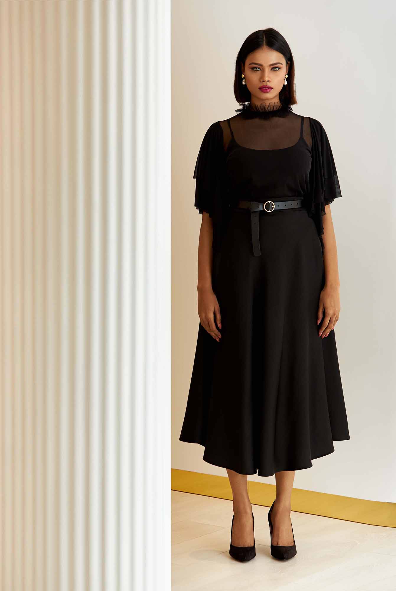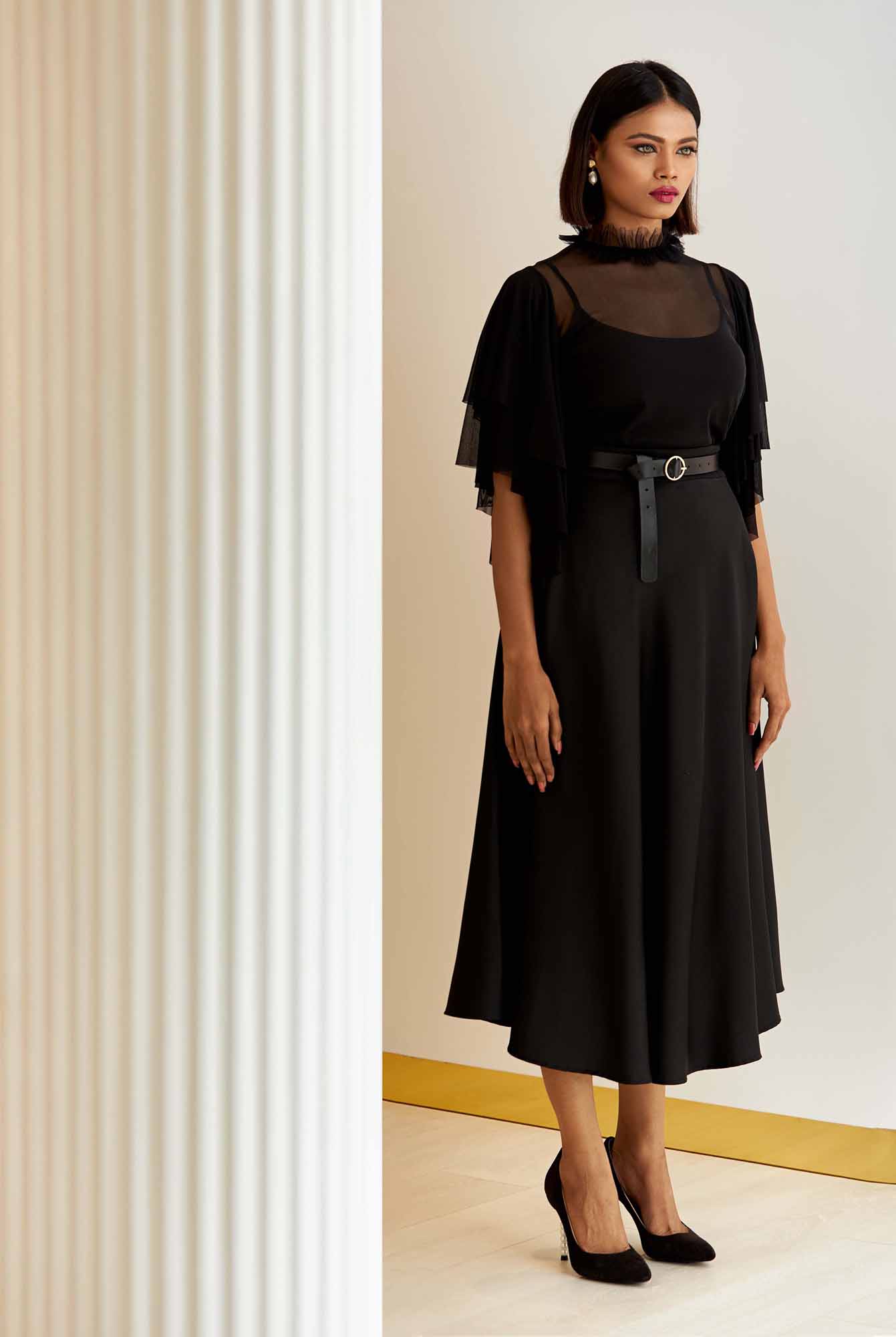 Add a sense of drama with this sheer piece, while style with tucking it inside a swishing full skirt or tailored trousers to bring a sense of elegance.