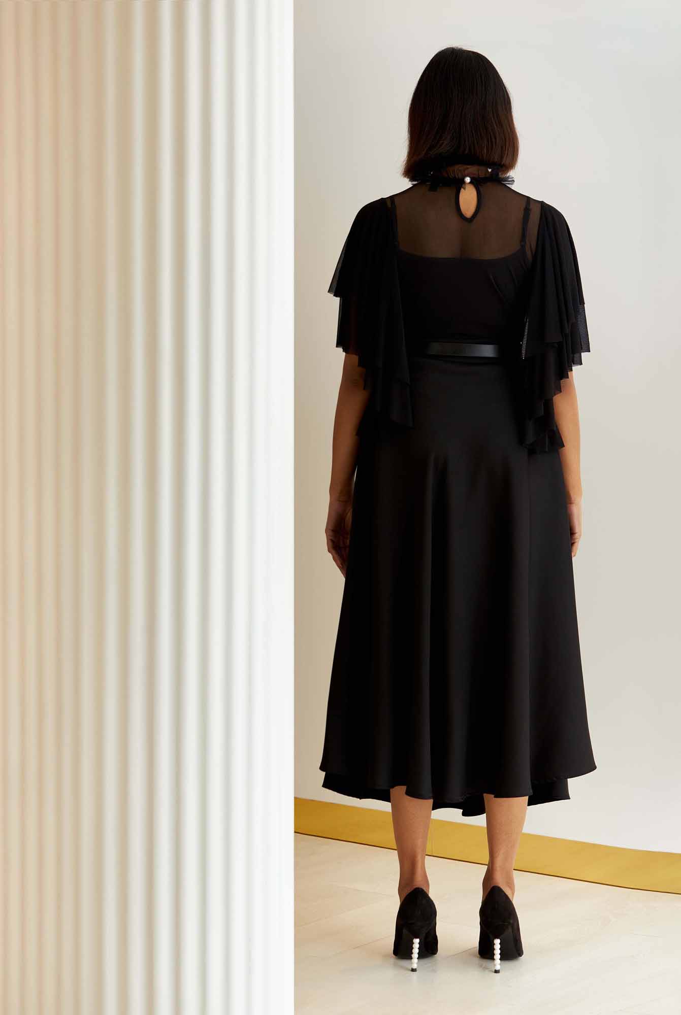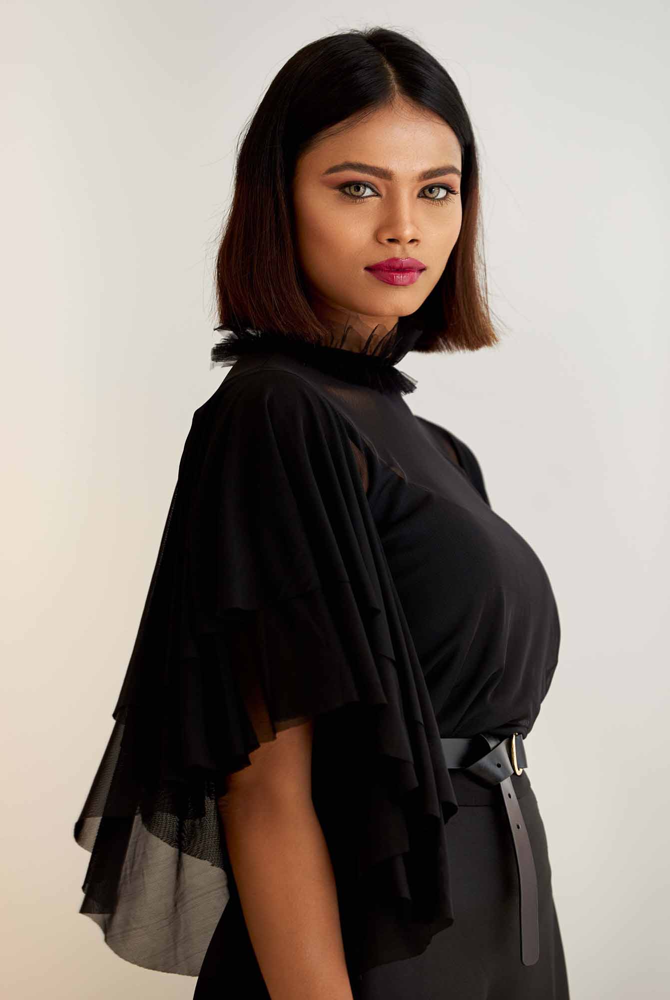 Our modernised sheer top is crafted from a supple and smooth specialised tulle with a hand pleat gathered neckline and uses his famous lampshade pattern in our dramatic ruffled and tiered sleeves, that falls to a loose boxy bodice.
