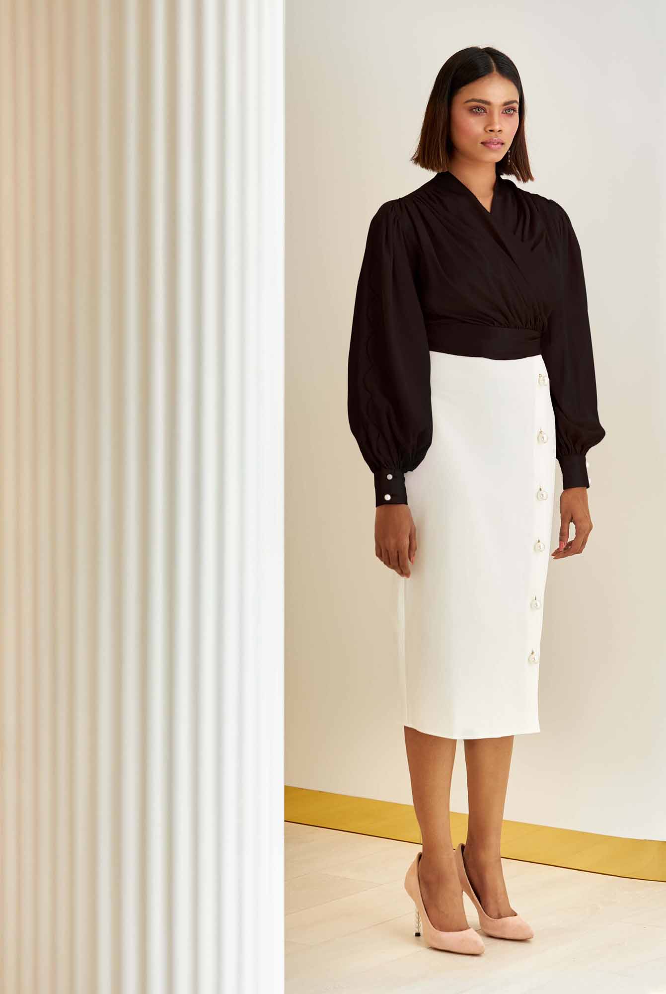 Style this commanding design against high-rise tailored trousers or skirts for an imbued romantic touch.
