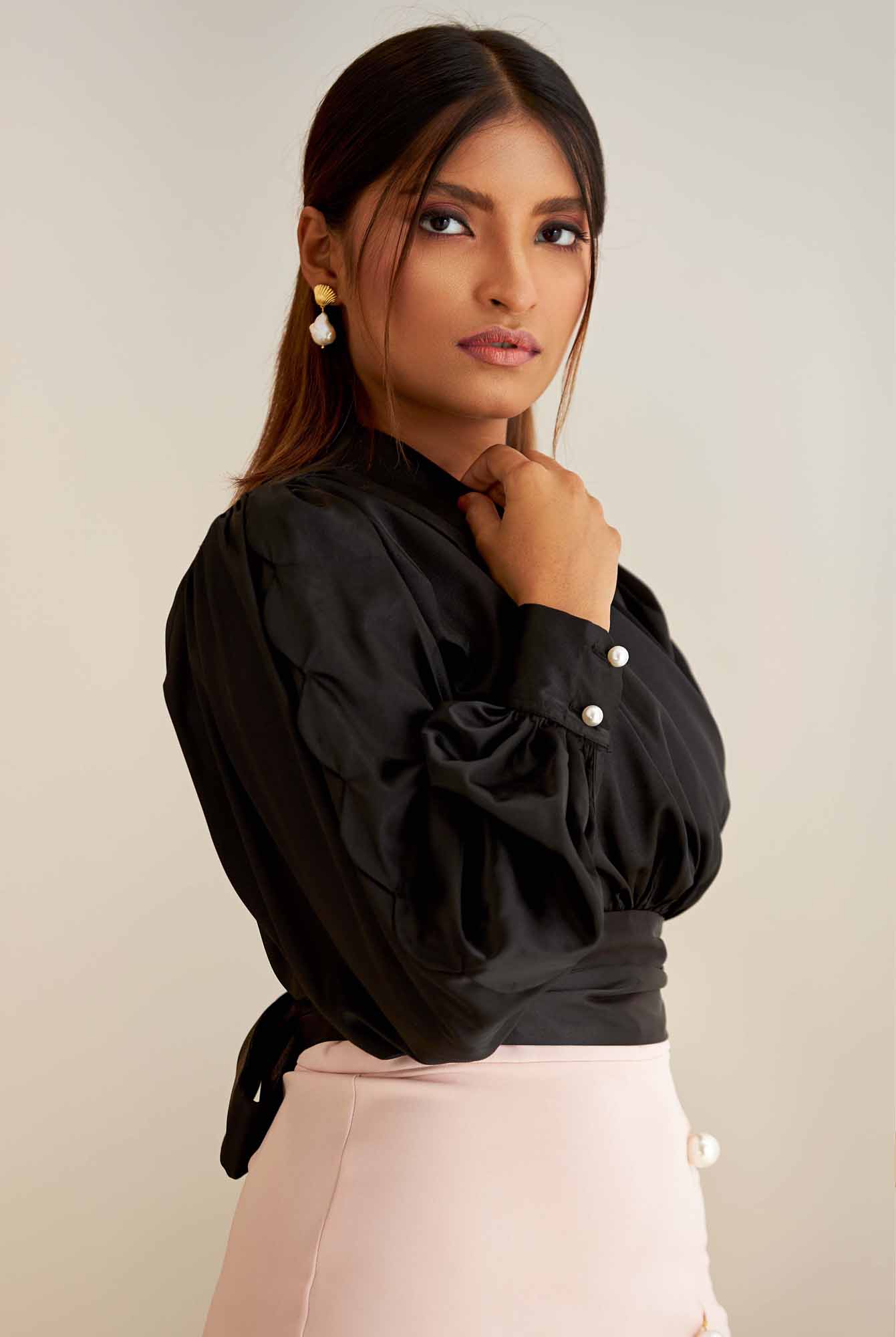 Grace Kelly’s beloved character Lisa Carol was the source of inspiration for this lustrous satin blouse. The romantic era’s wrap silhouette is rendered from smooth satin with gathered bodice and a wrapped front secured with long waist ties. The pearl buttoned cuff and voluminous sleeves are elevated by scalloped hem mimicking the curves in edges of a shell, resulting in an enduring femininity.