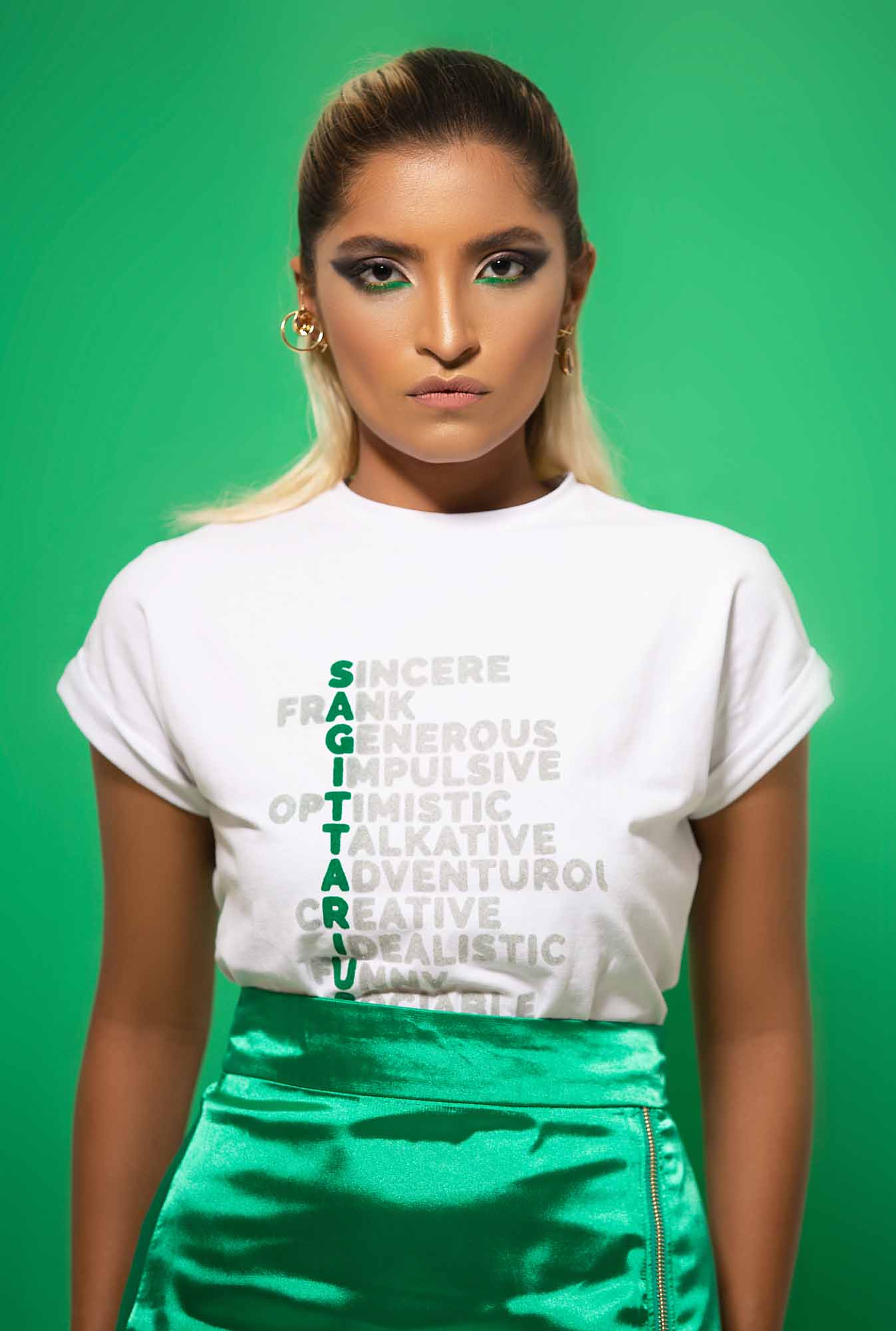 This T-shirt is part of the Zodiac Collection, that studied the personas of each zodiac to narrow down their unique traits. These traits have been flocked printed in their lucky colour onto the white cotton silhouette to finally collectively spell out SAGITTARIUS.