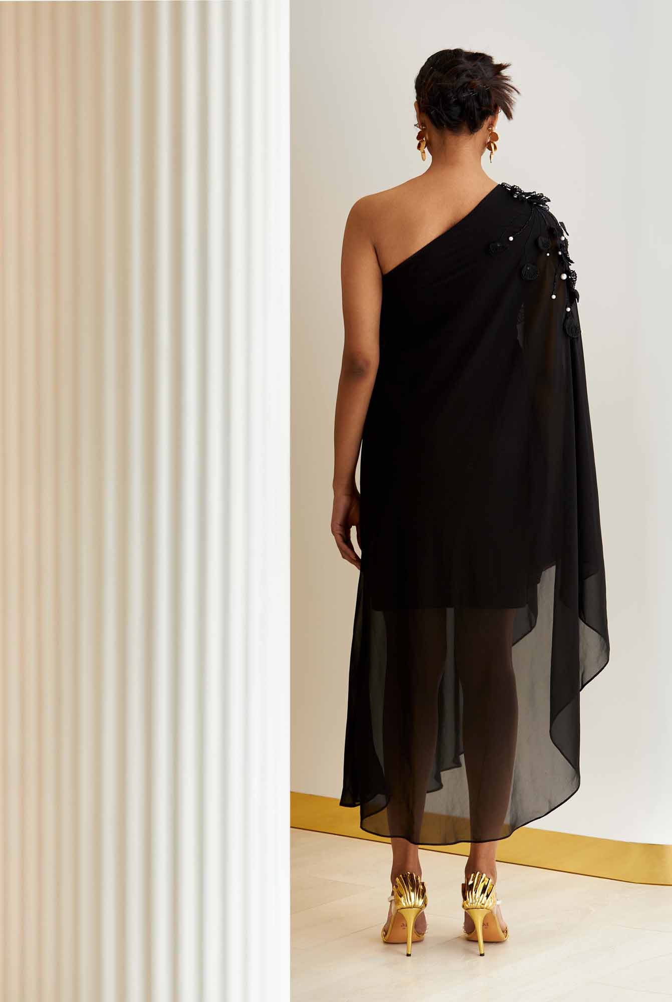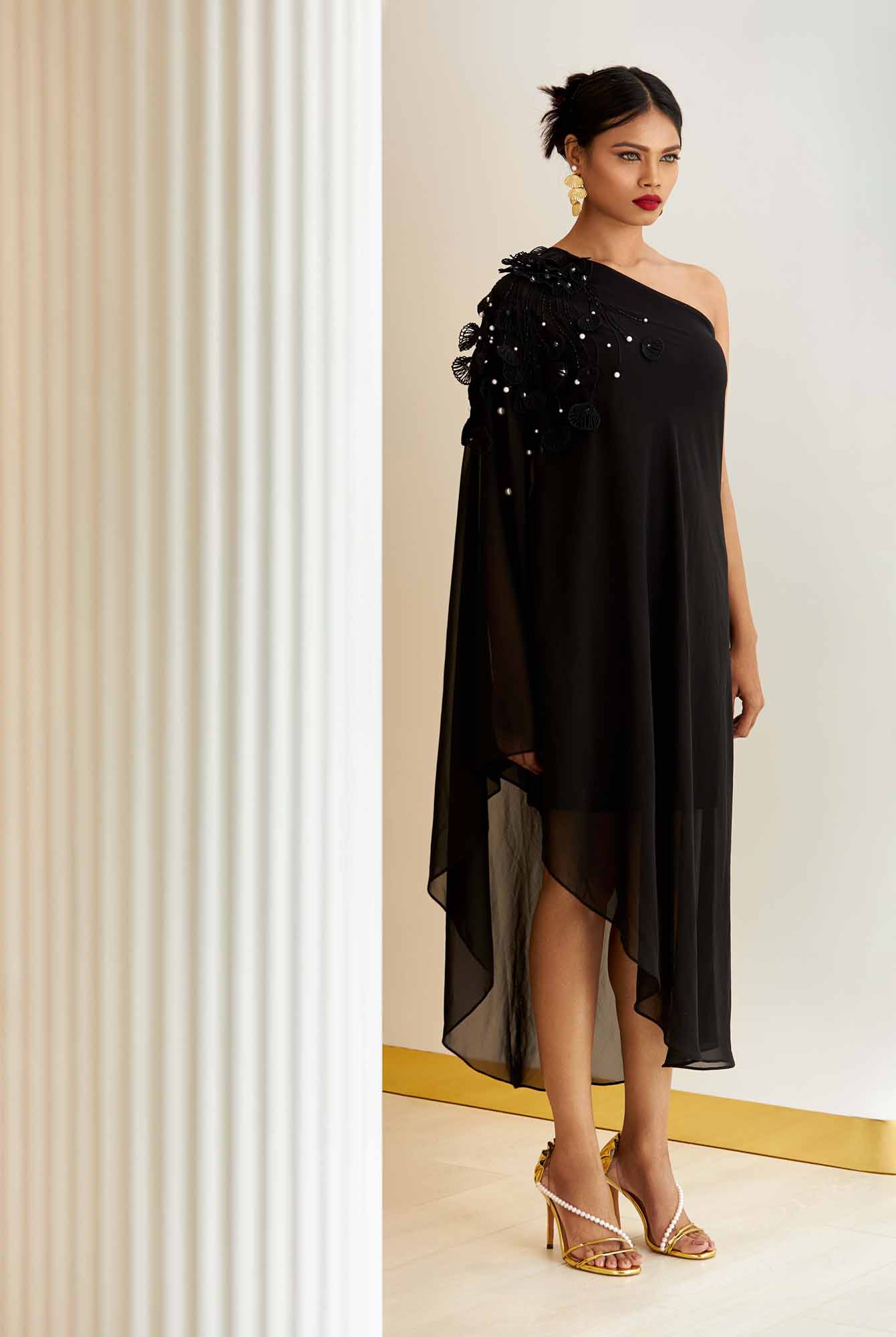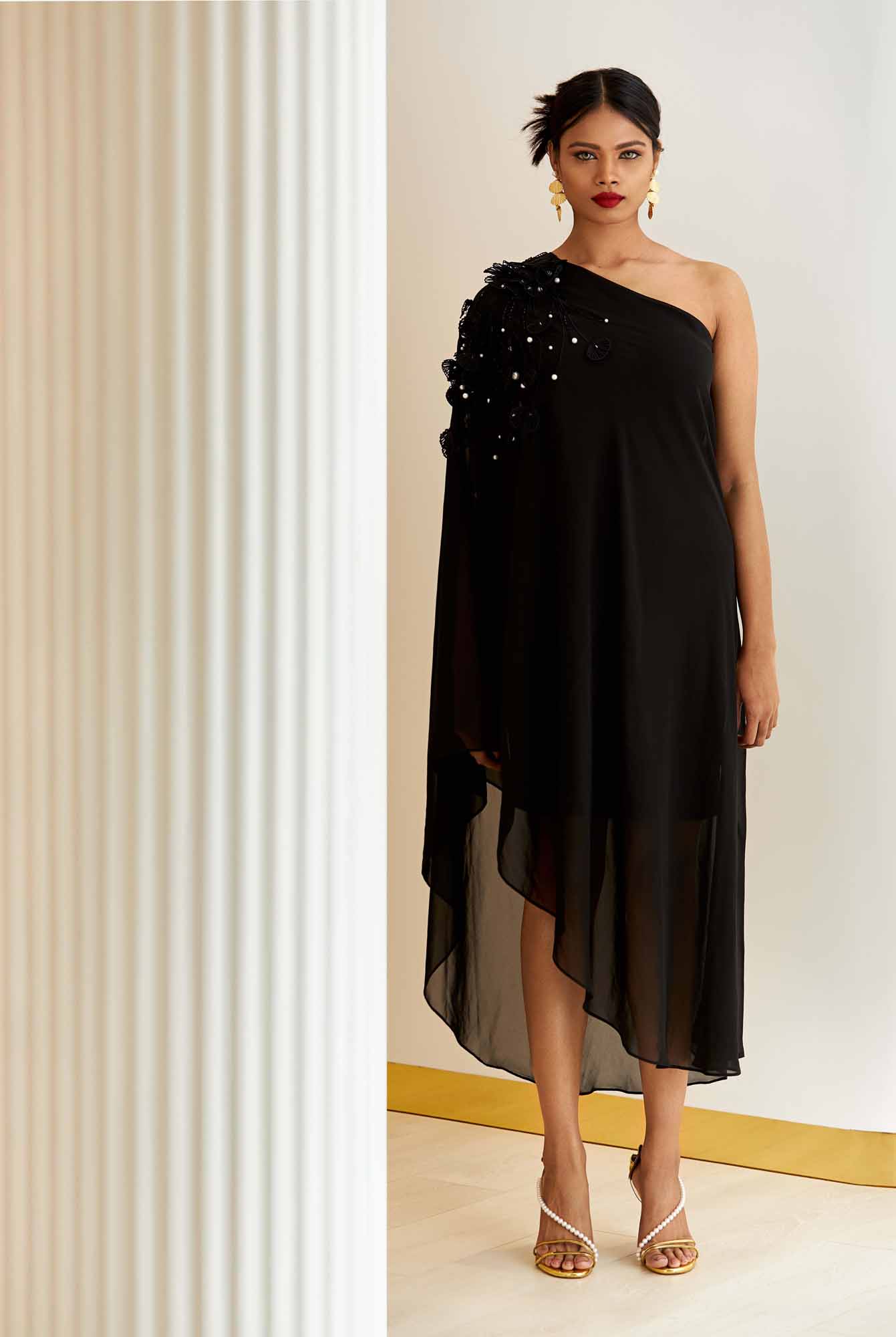 The midi dress has a relaxed georgette cape-like silhouette and falls beautifully from one-shoulder with an asymmetric hem.