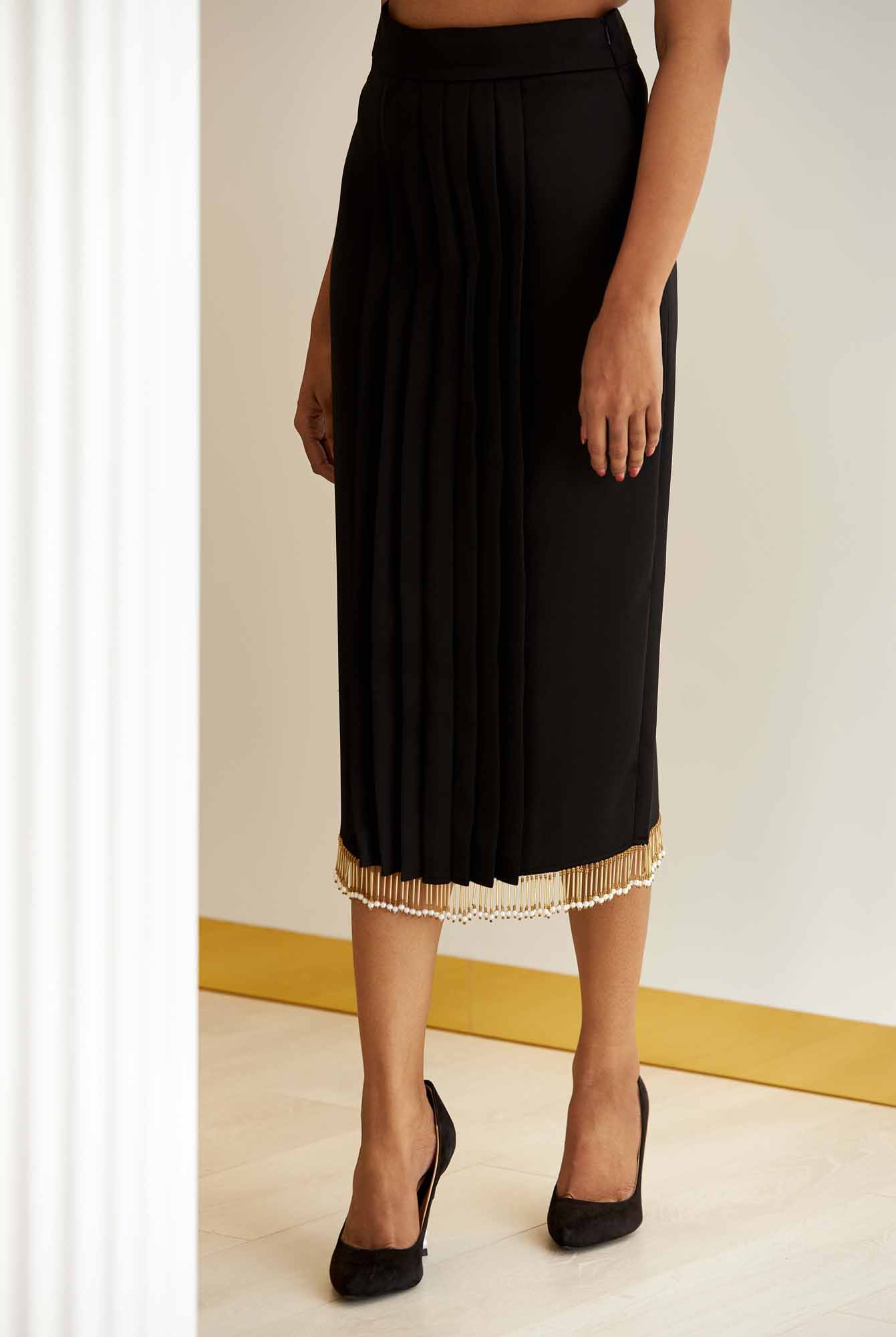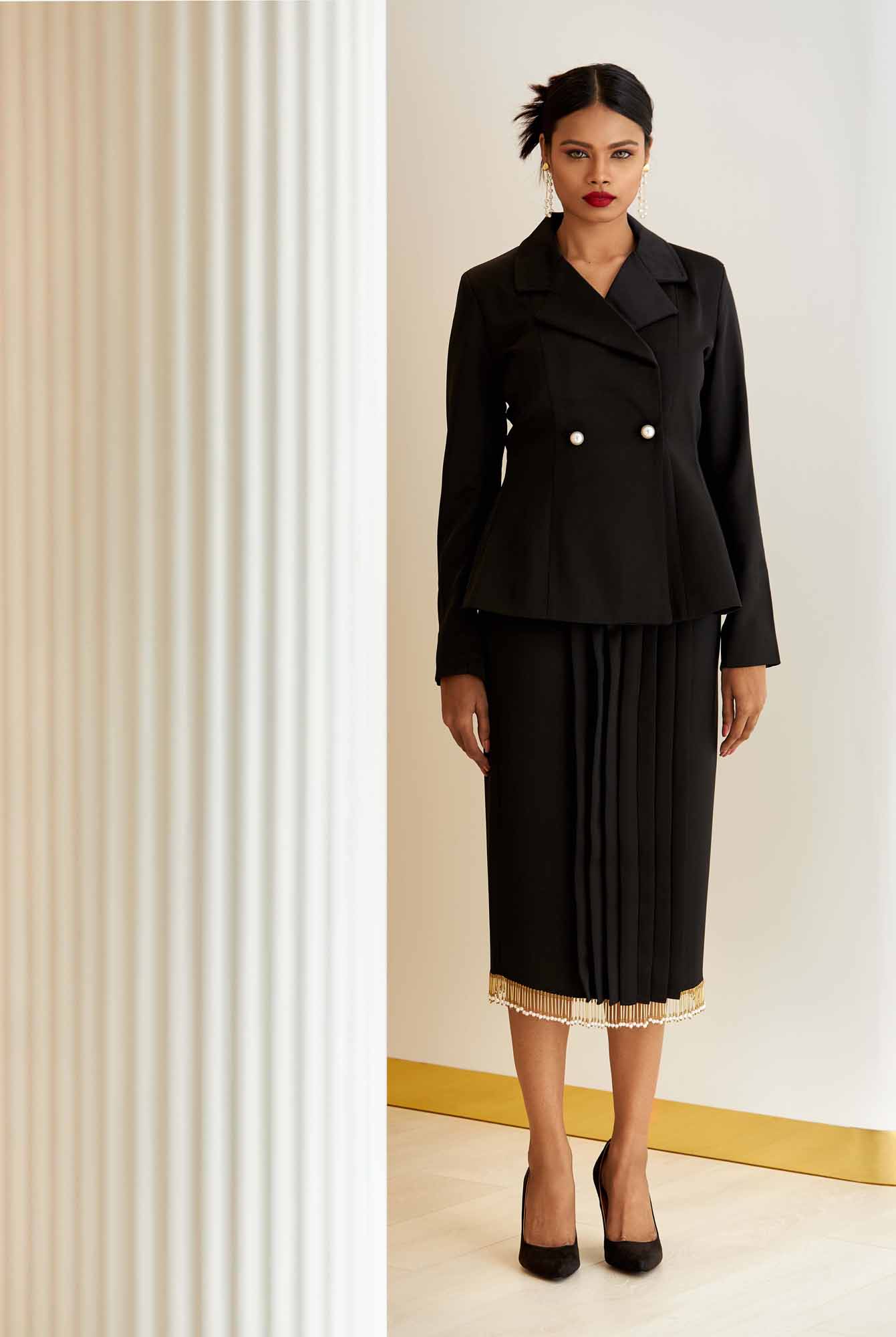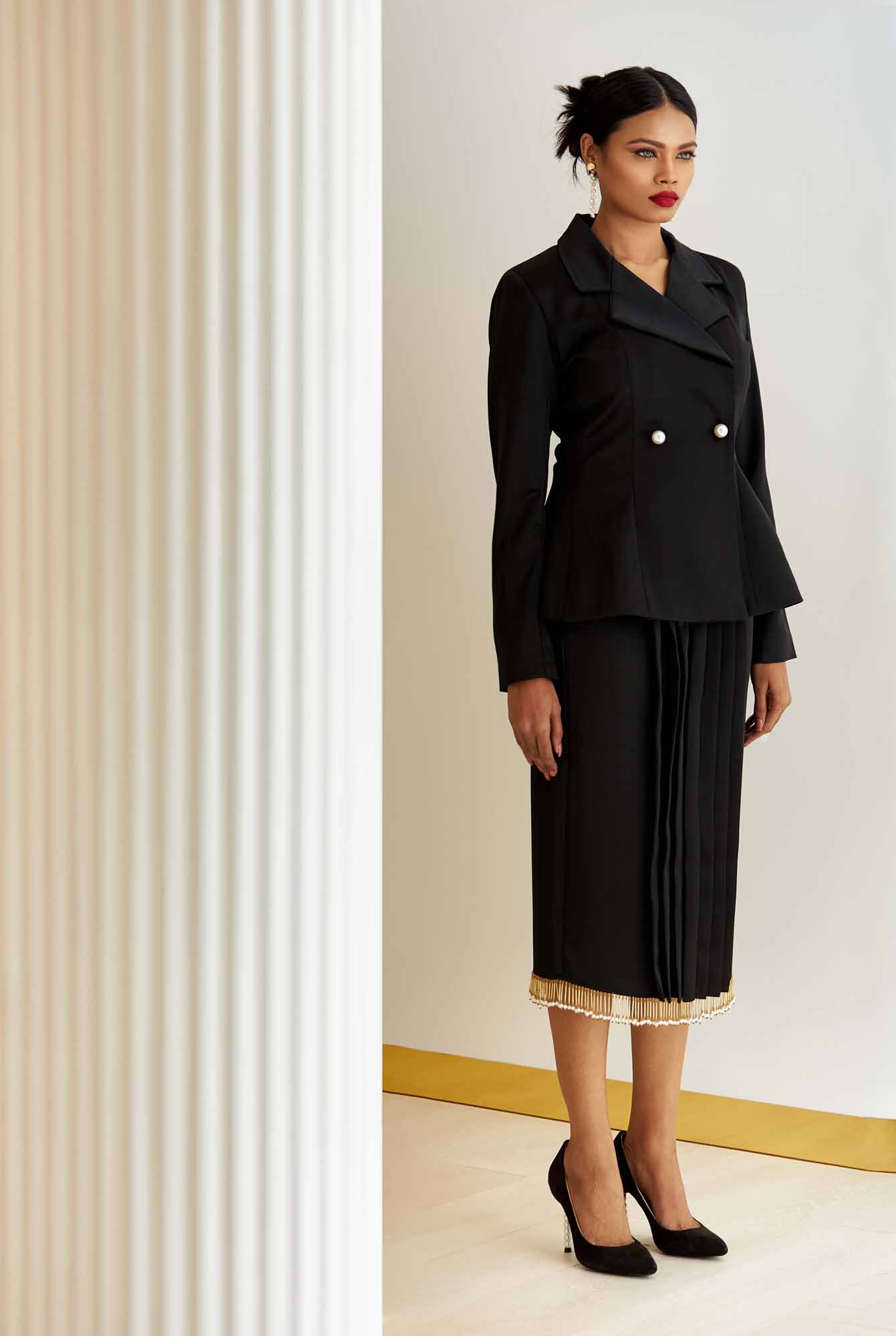 Our pencil skirt is inspired by 50s darling Dorian Leigh’s stunning attires and their graceful fluidity.  It is crafted to a slim shape with hand-made pleats lined in the centre front to mimic the pleating seen on the façade of a shell. The glamour quotient is boosted through embellishment with artificial pearls, glass beads and pipes along the bottom hem.
