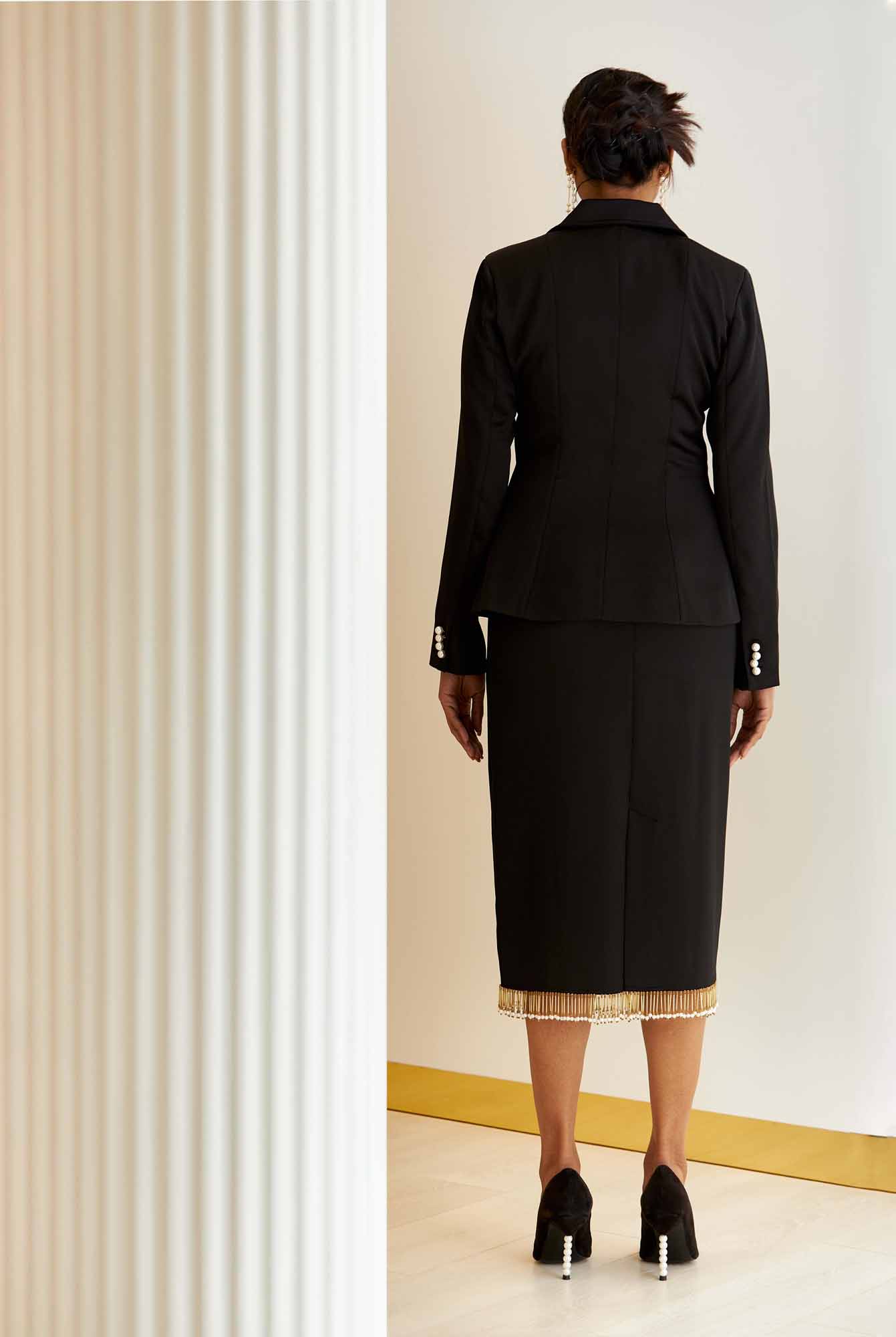 Style it with our bar suit and pearl heeled pumps to channel classic sophistication.