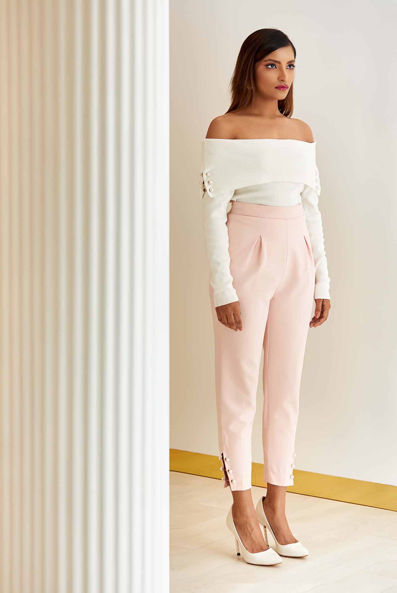 Continuing with our love affair with 50s inspired silhouettes -we crafted this expertly tailored high-rise cigarette trousers. The staple piece is accentuated by the addition of large box pleats in the front and elevated by logo debossed gold-tone pearl embellished metal screw bar that connects the slit in the side seam – thus creating a style that is feminine with an edge, a nod to the character’s persona.
