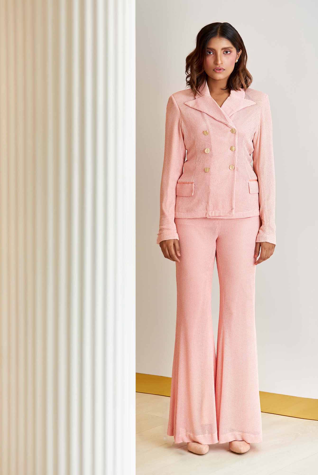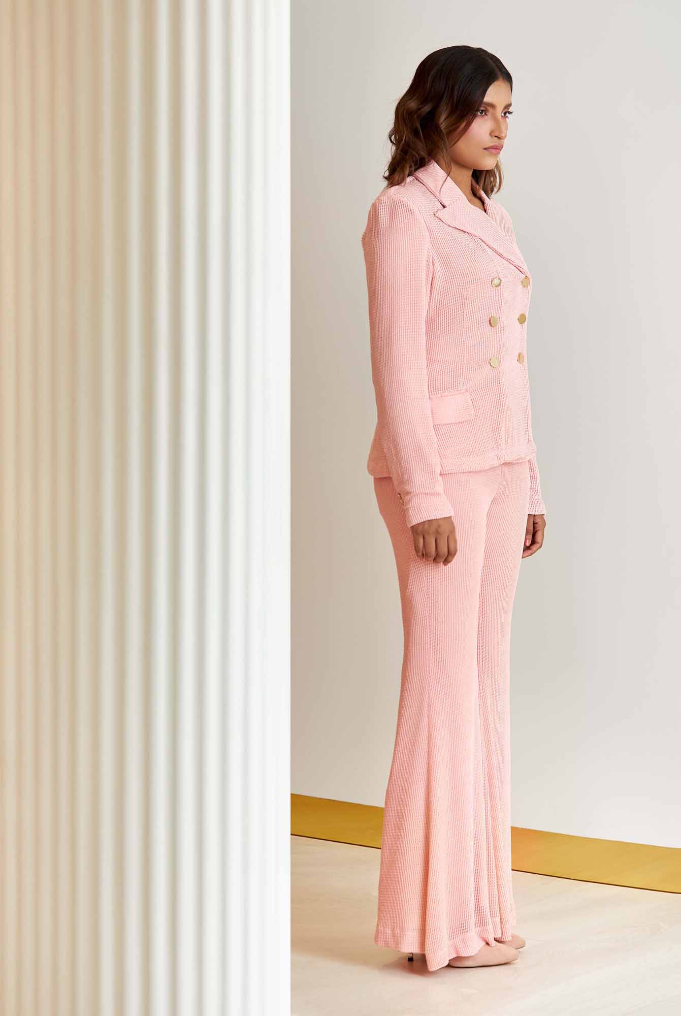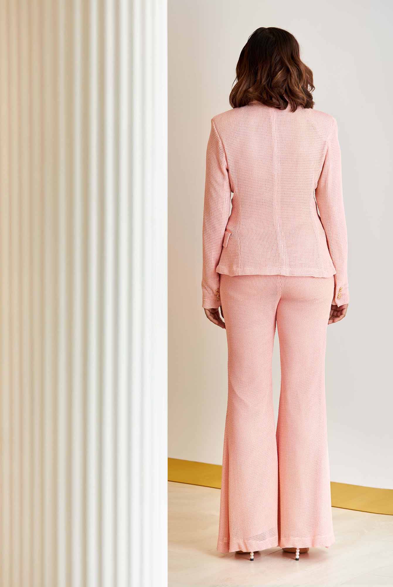 • Flared legs Pearls have always symbolised elegance ad femininity, and when we look at clothes of today, that is something that we miss. Therefore, when we were designing our debut collection, we explored deep into the beauty of this gem and took refuge in the era that adulated pearls the most. The era shaped out imagination of style. Our Debut collection aptly titled “Namesake” is a celebration of the sensibilities of the bygone era Of what our name, the gem “Pearl” stands for – romanticism and femininity. Painted with the most appreciated hues of the pearl – white, black & pink; The timeless pieces are inspired by the textures and forms of not only the gem, but also reminiscent of their birthplace.